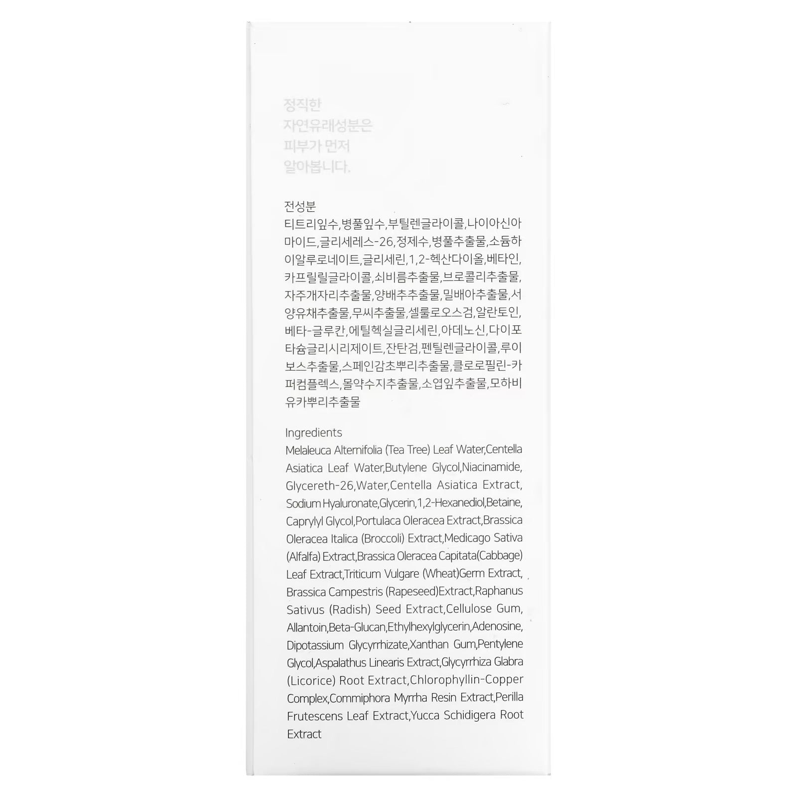 Melaleuca alternifolia (tea tree) leaf water, centella asiatica leaf water, butylene glycol, niacinamide, glycereth-26, water, centella asiatica extract, sodium hyaluronate, glycerin, 1,2-hexanediol, betaine, caprylyl glycol, portulaca oleracea extract, brassica oleracea italica (broccoli) extract, medicago sativa (alfalfa) extract, brassica oleracea capitata (cabbage) leaf extract, triticum vulgare (wheat) germ extract, brassica campestris (rapeseed) extract, raphanus sativus (radish) seed extract, cellulose gum, allantoin, beta glucan, ethylhexylglycerin, adenosine, dipotassium glycyrrhizate, xanthan gum, pentylene glycol, aspalathus linearis extract, glycyrrhiza glabra (licorice) root extract, chlorophyllin-copper complex, commiphora myrrha resin extract, perilla frutescens leaf extract, yucca schidigera root extract.