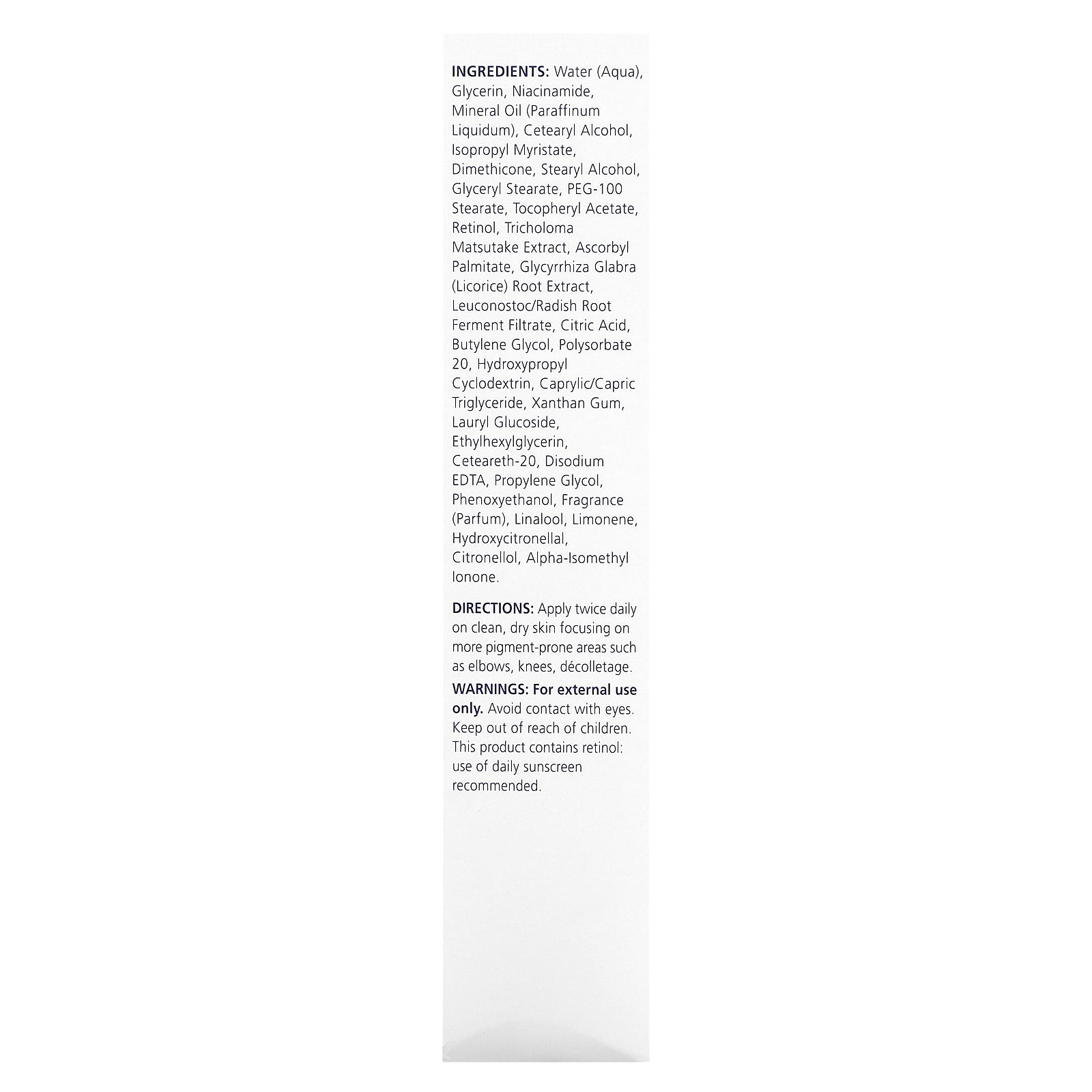 Water (aqua), glycerin, niacinamide, mineral oil (paraffinum liquidum), cetearyl alcohol, isopropyl myristate, dimethicone, stearyl alcohol, glyceryl stearate, peg-100 stearate, tocopheryl acetate, retinol, tricholoma matsutake extract, ascorbyl palmitate, glycyrrhiza glabra (licorice) root extract, leuconostoc/radish root ferment filtrate, citric acid, butylene glycol, polysorbate 20, hydroxypropyl cyclodextrin, caprylic/capric triglyceride, xanthan gum, lauryl glucoside, ethylhexylglycerin, ceteareth-20, disodium edta, propylene glycol, phenoxyethanol, fragrance (parfum), linalool, limonene, hydroxycitronellal, citronellol, alpha-isomethyl ionone.