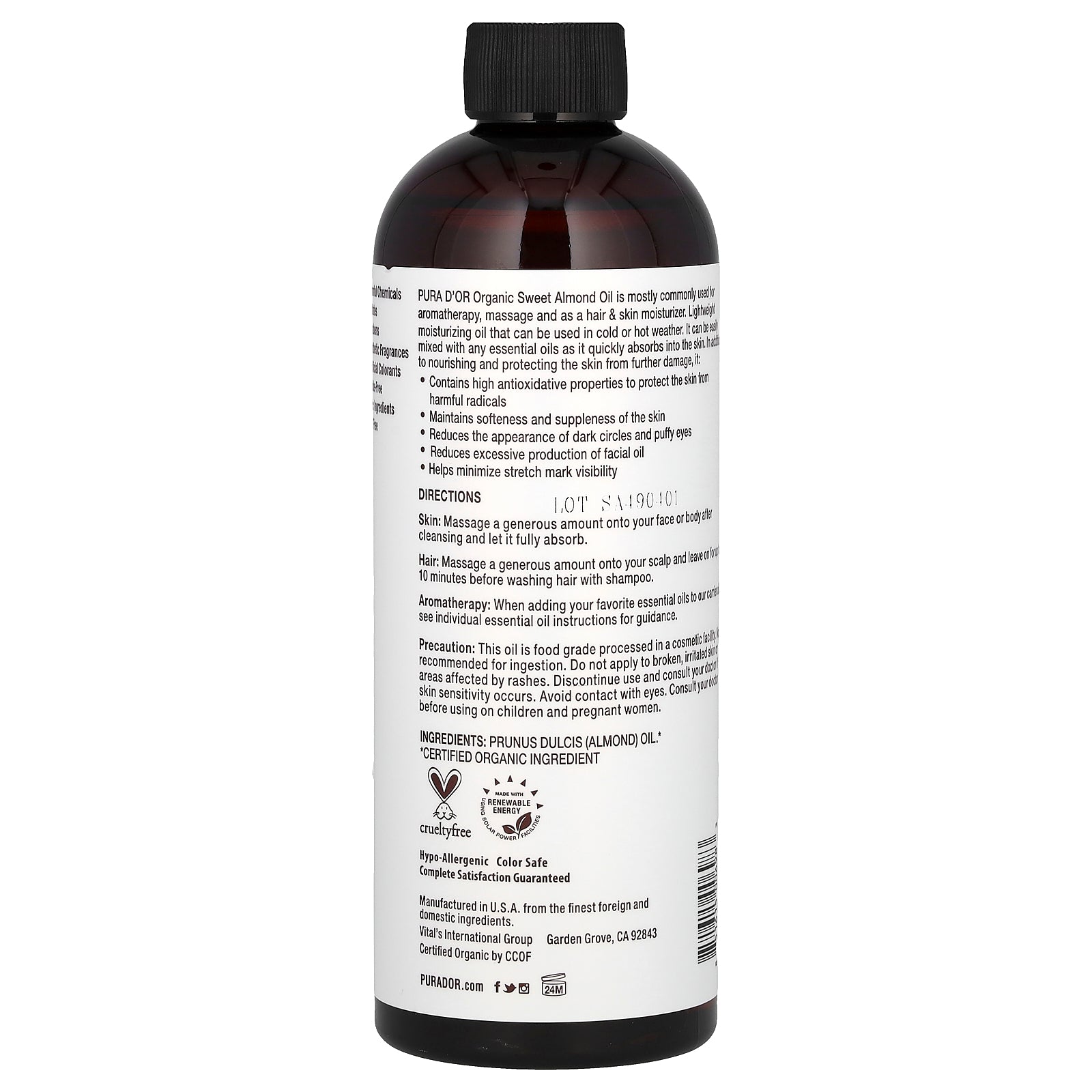 Pura D'or Organic Sweet Almond Oil is mostly commonly used for aromatherapy, massage and as a hair & skin moisturizer. Lightweight, moisturizing oil that can be used in cold or hot weather. It can be easily mixed with any essential oils as it quickly absorbs into the skin. In addition to nourishing and protecting the skin from further damage, it: